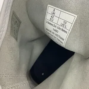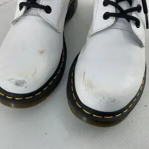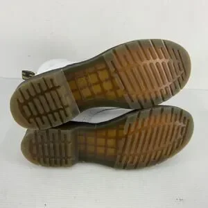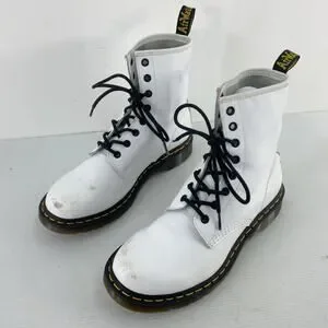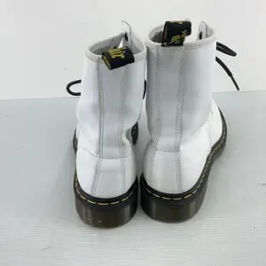 Classic Dr. Martens 8-eye combat boots. White leather upper with black laces and signature yellow welt stitching. Sturdy rubber sole with pull tabs. Bold, iconic style for everyday wear.
