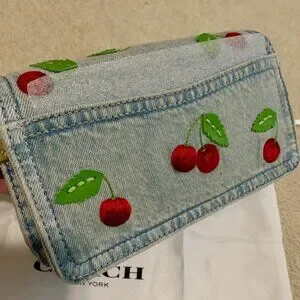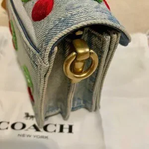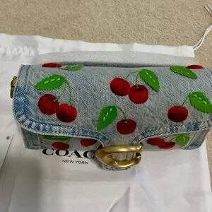 Coach Denim Tabby 20 with Cherries NWT, retail tag is detached. Unwrapped bag just for photos and rewrapped again. Has 2 straps as shown in the photo with the wrapping.