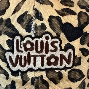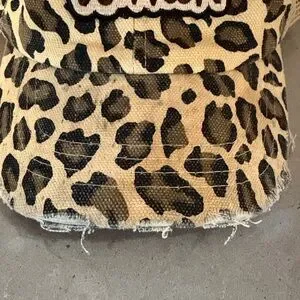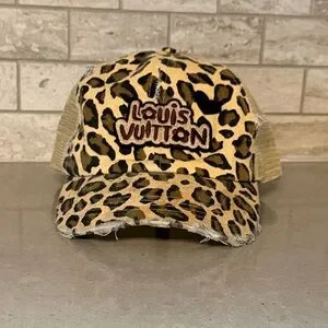 Leopard print trucker hat with mesh back. Frayed brim for a rugged vibe. Embroidered patches on front. Classic tan and black palette.