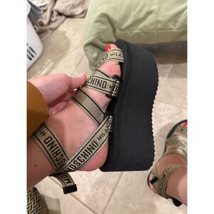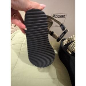 The Moschino Logo Tape multi-strap sandals in black and gold are a stylish and versatile option for women's summer footwear. Featuring a strappy design with the iconic Moschino logo accents, these sandals are perfect for casual occasions. The solid black color with hints of gold adds a touch of luxury, making them a fashionable choice for any summer ensemble. The comfortable straps and trendy style make these sandals a must-have for any fashion-forward woman's closet.
