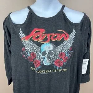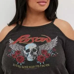 Rock your vintage band-tee vibe with this Torrid Vinyl Icons Poison cold-shoulder sweatshirt. Featuring the iconic “Every Rose Has Its Thorn” skull + wings + roses graphic, this top blends edgy style with Torrid’s comfy fit.