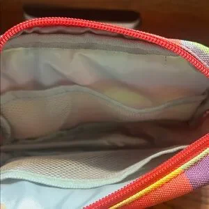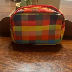 Vibrant bright & cheerful checkered canvas pouch with a zippered closure. Perfect for organizing small items. Interior mesh pockets on each side.