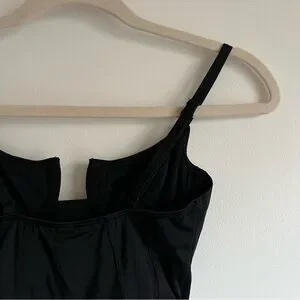 Flattering design. One piece. Adjustable spaghetti straps. Underwired cups (non-padded). Panel seams details at bust and waist. Cut high on the leg. Moderate back coverage. Lined (double-layered), no sheerness. Lightweight, soft fabric with stretch. Shell 80% polyamide, 20% spandex, lining 85% polyamide, 15% spandex. Made in Morocco. Hand wash cold (dry flat).