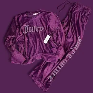 Juicy Couture purple velour lounge set with crystal-logo details. Soft velour fabric for comfortable wear. Elastic waistband on pants for easy fit. Stylish rhinestone 'Juicy' branding on top and down the pant leg.