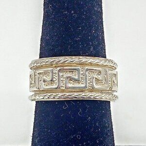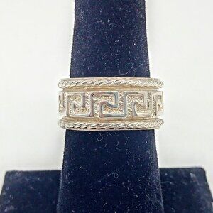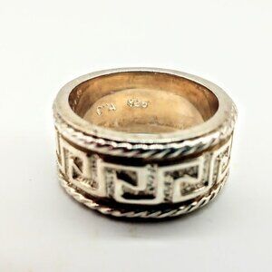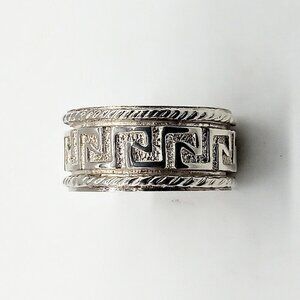 Solid 925 sterling silver wide band ring with Greek key and rope design.
