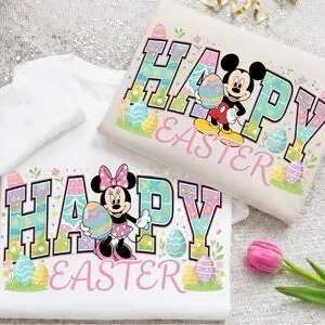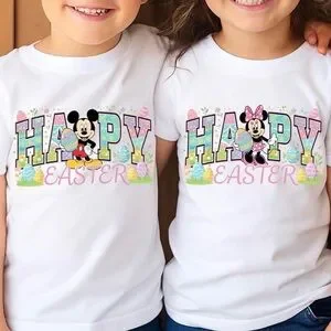Disney kids short-sleeve tee featuring Minnie Mouse or Mickey Mouse and colorful "Happy Easter" graphics. Bright white shirt with pastel accents for a festive spring look. Soft, comfortable fabric that's perfect for holiday fun.