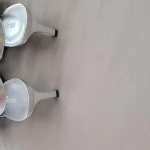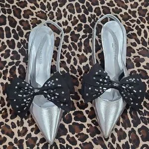These Karl Lagerfeld heels boast a sleek metallic silver finish complemented by a striking black bow, adding a touch of elegance to any ensemble. The pointed toe and slingback design enhance their sophisticated appeal, making them a perfect choice for both formal and casual occasions.