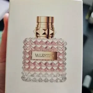 Valentino branded fragrance box in soft blush pink. Simple embossed detailing and subtle sheen. Clean, elegant packaging for display or gifting.