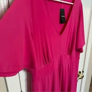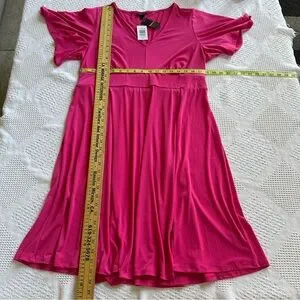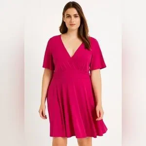 This solid dark pink dress features flutter sleeves and a V-neckline, offering a flattering fit and flare silhouette.