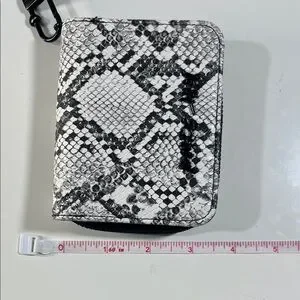 Compact wallet in black and white snake- print. Secure zip and flap design keeps essentials organized. Versatile black and white finish pairs with casual and dressy looks. Has card slots and clear ID along with Bill’s compartment.