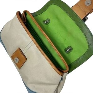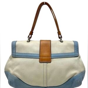 Classic Coach Soho Buckle Flap Shoulder Bag featuring a soft cream canvas body with powder blue leather trim and tan leather strap. This style is known for the signature Soho buckle flap closure and relaxed silhouette that made the Soho line so popular.