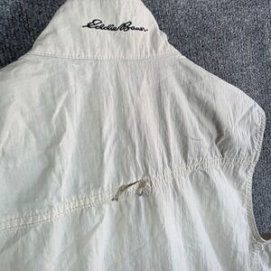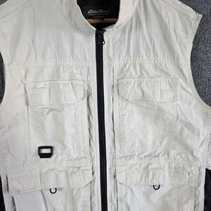 Classic Eddie Bauer outdoor utility vest designed for fishing, travel, hiking, or photography. This versatile vest features multiple storage pockets, breathable mesh side panels, and a large rear game pocket for extra storage. Lightweight cotton blend construction makes it comfortable for warm weather adventures and layering.