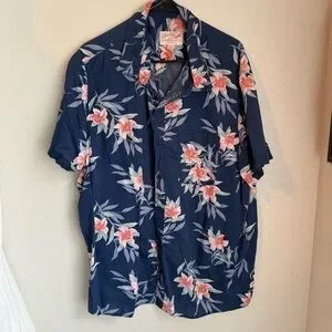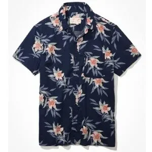 This casual button-down shirt from American Eagle Outfitters features a vibrant blue base adorned with pink floral patterns, perfect for a relaxed and stylish look. The short-sleeved design and classic collar make it an ideal choice for casual outings or laid-back gatherings. Enjoy the blend of comfort and style with this eye-catching shirt. Gently used, comfortable, light material