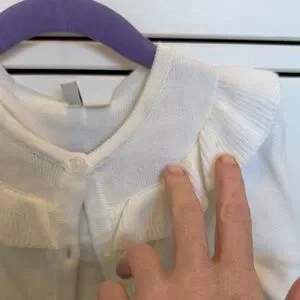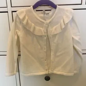 Lightweight knit cardigan with a ruffled collar. Button-front closure for easy wear. Simple, elegant silhouette for layering.