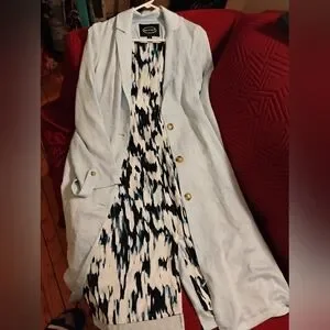 Chic light blue silky long spring trench coat with button front. with a silky blue and white patterned inner lining Lightweight drape and effortless layering. Versatile and modern color combo.