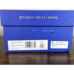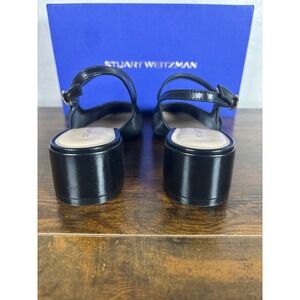 Stuart Weitzman Maeve Mary Jane slingback pumps offer a sophisticated blend of textures with a mesh gala body and polished lacquer nappa leather accents. These elegant shoes feature a modern square toe and a comfortable low block heel, secured by adjustable double straps with gold-tone buckle hardware. The breathable mesh panels provide a contemporary sheer look, while the sturdy leather toe cap and heel counter ensure lasting structure. Perfect for transitioning from office wear to evening events, these versatile black pumps come with their original designer box.