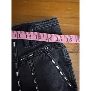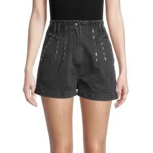 IRO black denim shorts with a high-waisted silhouette and decorative silver-tone embellishments along the front pockets and waistband. Designed for a stylish and modern look, these shorts offer a comfortable fit and a unique detailing that adds a touch of edge. Perfect for a casual day out or a night on the town