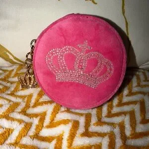 Stylish pink round coin purse with crystal crown detailing. Soft velvet-like finish for a luxe feel. Includes a matching crown keychain accent for easy carrying. Perfect for small essentials and everyday use.