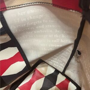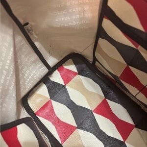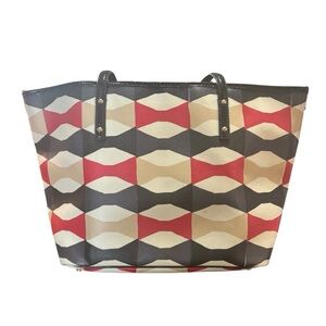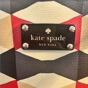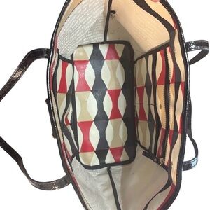 Beautiful geometric pattern tote bag by Kate Spade. Storybook lining. Measures approximately 16.5 inches wide, 10 inches tall, 6 inches deep. Patent leather handles and trim. No cracking on either.