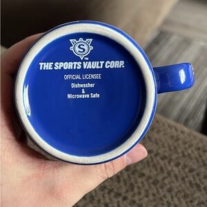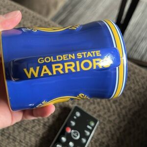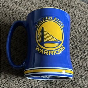 This is a ceramic mug featuring the Golden State Warriors logo. It is officially licensed by The Sports Vault Corp and is both dishwasher and microwave safe.