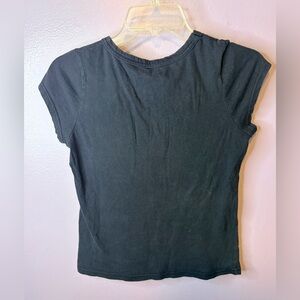 Vintage Cherry short sleeve graphic tee featuring a sparkly sequin logo with classic Y2K bling vibes. Soft black material with a flattering V-neck and fitted silhouette. There’s no material tag but it feels like a cotton blend. Women’s size XS (approx.) with a 15.5” pit-to-pit measurement. There’s no size tag so please compare to your favorite tee for best fit. This top is very small. Preowned in good vintage condition with light wear consistent with age.