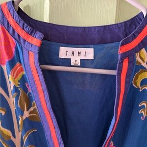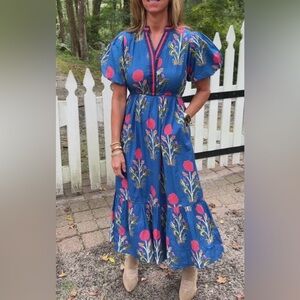 THML Floral dahlia puff sleeve Midi Dress blue green