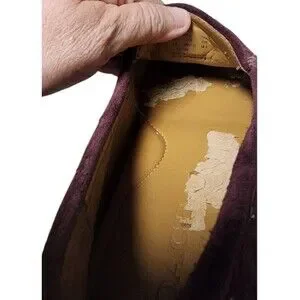 The COACH Amber Suede Loafer in Burgundy is a stylish and comfortable option for women looking for a versatile shoe. Featuring a slip-on closure and round toe shape, these loafers are perfect for casual, workwear, or travel occasions. Made with leather lining and a cushioned insole, these shoes provide arch support and are breathable, making them ideal for year-round wear. The burgundy color, solid pattern, and logo accents add a touch of elegance, while the rubber outsole ensures durability. With the renowned Coach brand and quality craftsmanship, these loafers are a chic addition to any wardrobe. Some peeling inner lining.