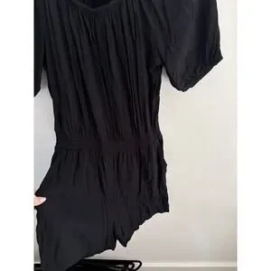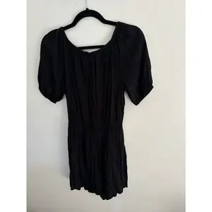 Loft Petites black short sleeve romper crafted with a comfortable smocked elastic waistband and a flattering scoop neckline. This versatile piece features a lightweight, textured fabric with subtle pleated detailing at the chest and puff-style sleeves for a feminine touch. Ideal for casual summer outings or dressed up with accessories, it offers a relaxed yet put-together silhouette.