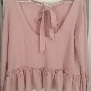 Whimsical blush colored blouse with ruffle peplum bottom from Anthropologie Cloth & Stone. Ideal for versatile styling. Has cute tie with an open U shaped back. Minimal Wear.