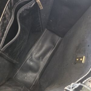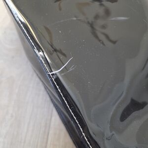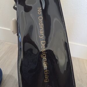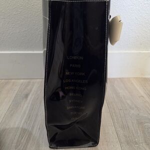 Ted Baker black patent tote with a contrasting ivory bow accent. Sleek, glossy finish that elevates everyday looks. Structured design with comfortable shoulder straps. Stylish and versatile for work or weekend.