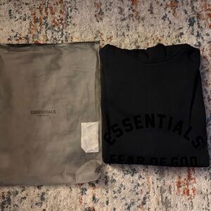 Black Fear of God hoodie with raised ESSENTIALS logo across the chest. Pullover style with attached hood. Kangaroo pocket and ribbed cuffs and hem. Minimal monochrome streetwear aesthetic.