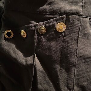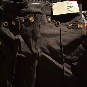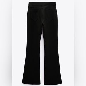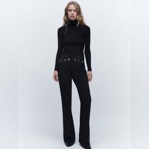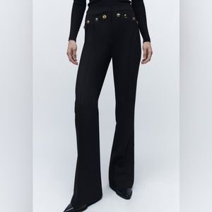 High-waist trousers with back patch pockets. Flared hems. Contrast metal button appliqué detail. Metal hooks, inside button and zip fastening.