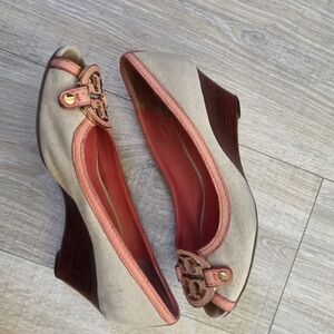 Tory Burch flats in beige canvas with coral/pink leather trim. Round-toe ballet silhouette with signature metal logo medallion. Cushioned coral insole for comfort. Casual yet refined styling for everyday wear.