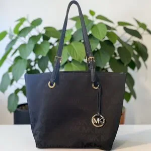 Gold-tone accents, including buckle details on the handles and a hanging MK logo charm