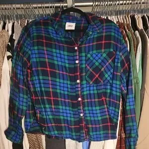 Soft plaid button-up shirt. Blue, green and red plaid pattern. Single chest pocket. Classic collared style. Comfortable everyday layer.