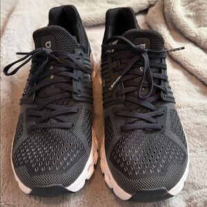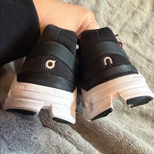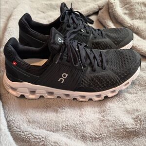 The On Cloudswift (Style: 41.99581) in Black/Rock is a women's lightweight, urban road-running shoe featuring a breathable mesh upper, dual-density Helion™ foam, and CloudTec® cushioning. It is designed for daily training, offering a responsive, cushioned ride with a 5mm heel-to-toe drop and a secure, sock-like fit.