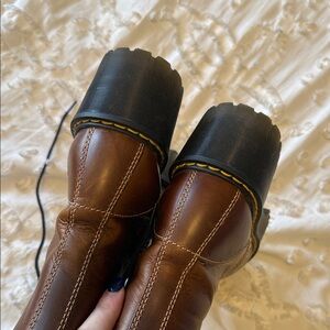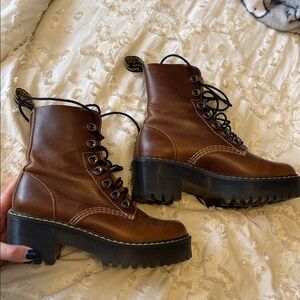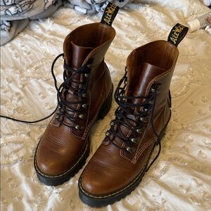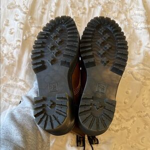Rugged brown leather boots with thick black soles. Lace-up design for a secure fit. Ideal for edgy style. Good used condition with some distressing in leather, butterscotch color. 37 size women’s