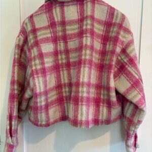 Zara Pink Ivory Plaid Cropped Shacket Oversized Trucker Jacket XS
