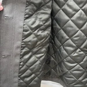 Lined, olive jacket with a classic collar. Features button closure and multiple pockets. Ideal for layering.