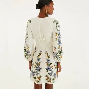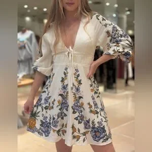 Chic mini dress with vibrant floral patterns. Features blue and yellow flowers on a white base. Perfect for stylish outings.