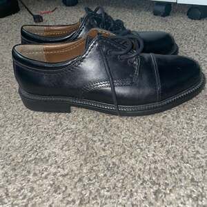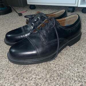 Dockers Men's Gordon Leather Cap Toe Oxford Dress Shoes in Black. These classic oxfords feature a polished leather upper with a traditional cap toe design, perfect for professional or formal occasions. The interior includes a cushioned footbed for all-day comfort and a durable lugged rubber outsole for traction.