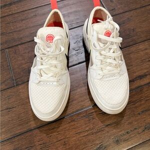 Low-top platform sneakers by Nike. White leather and mesh upper. Large black Swoosh on sides. Coral pull tabs and small coral Swoosh accent. Lace-up closure. Clean sporty look.
