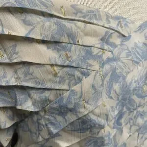 Back zipper closure with crossover pleated style design at the chest, gathering at the shoulders for a slight puff sleeve in a pretty cream and blue floral pattern