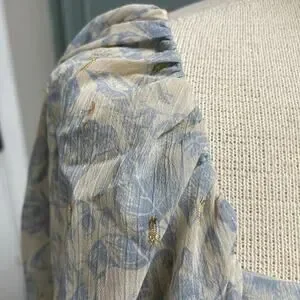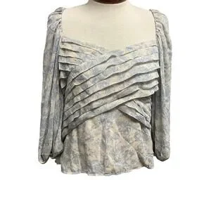 Express Blue Toile Floral Blouse Size Large Pleated Puff Shoulder Lightweight