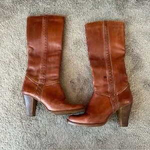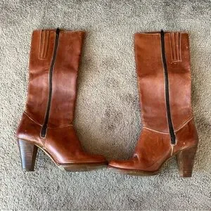 Authentic vintage tall leather boots dating to the 1970s–1980s. Crafted from genuine cognac brown leather with a classic stacked wood heel and full side zip closure. Beautiful original stitching details and a timeless silhouette typical of true vintage footwear.