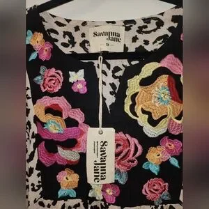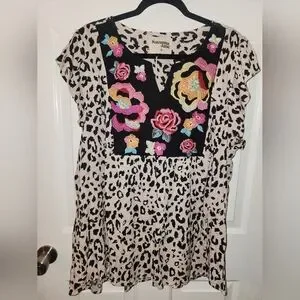 Elegant blouse with multicolor floral embroidery. Features a striking leopard pattern. Perfect for a bold look. New with tags. True to size 1xl. Could easily fit a 2xl.