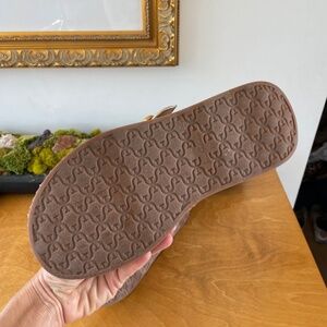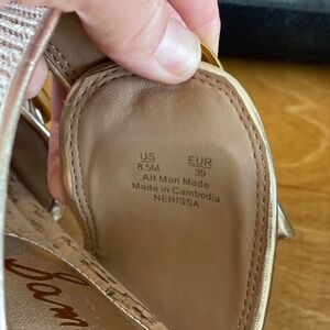 Sam Edelman raffia platform slide sandals with oversized gold buckles and a cork footbed. The natural raffia texture gives them that effortless coastal / resort look while the platform adds a little height and comfort. Easy to wear with linen, denim, or summer dresses.