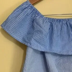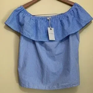 Lucky NWT Blue White Striped Ruffle Off Shoulder 100% Cotton Flounce Boxy Top S