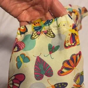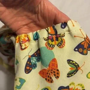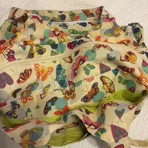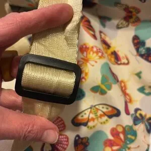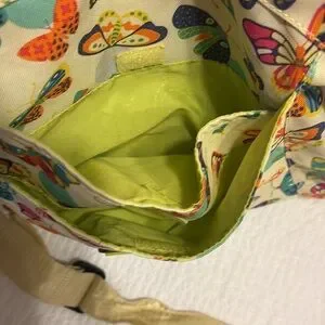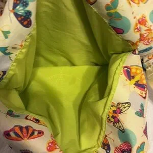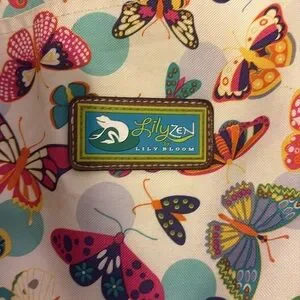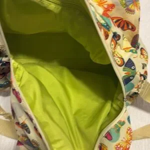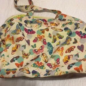 Lily Zen by Lily Bloom weekender bag with vibrant butterfly motifs. Dual handles for easy carrying and adjustable shoulder strap.two Velcro close compartments in front. One large Velcro close compartment next to zippered large compartment with internal zippered side pocket. Two pockets on side of bag for water bottles. Measurements are 15”H x 18” W x 6”D.