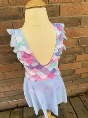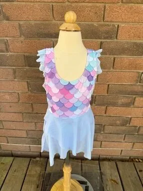 Adorable girls' skater dress with pastel mermaid scale bodice. Features layered scallop scales in pink, lavender, and light blue. Soft light blue skirt with flutter shoulder details. Playful and perfect for dress-up or everyday wear.